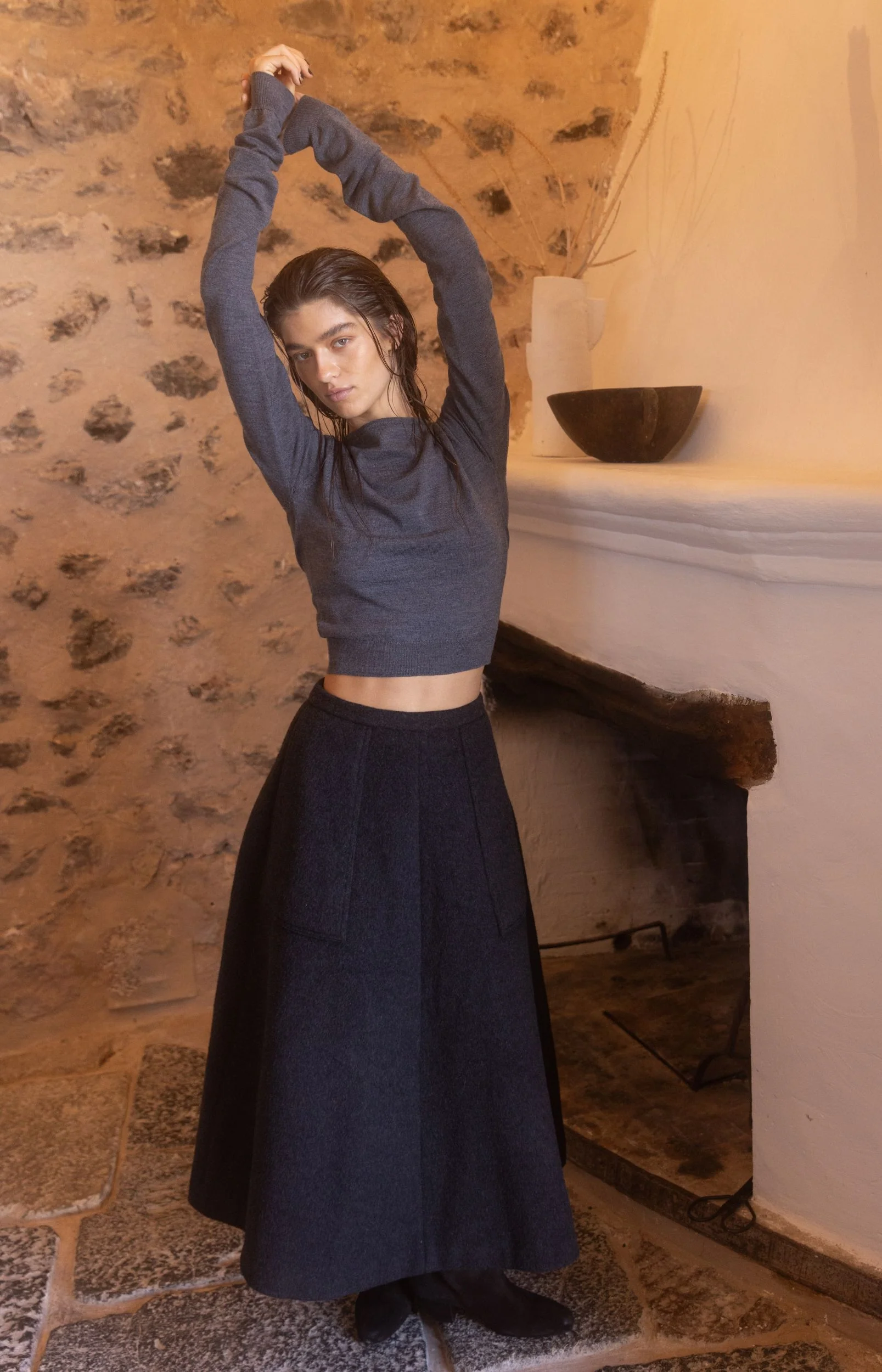 Denne skulpturelle A-formede lange skjørtet er laget av en eksklusiv blanding av kasjmir, alpakka og ull. Fasongen sitter til over hoftene og faller deretter i en lett elegant A-linje. Med store lommer. Passer perfekt til en oppkledd anledning.