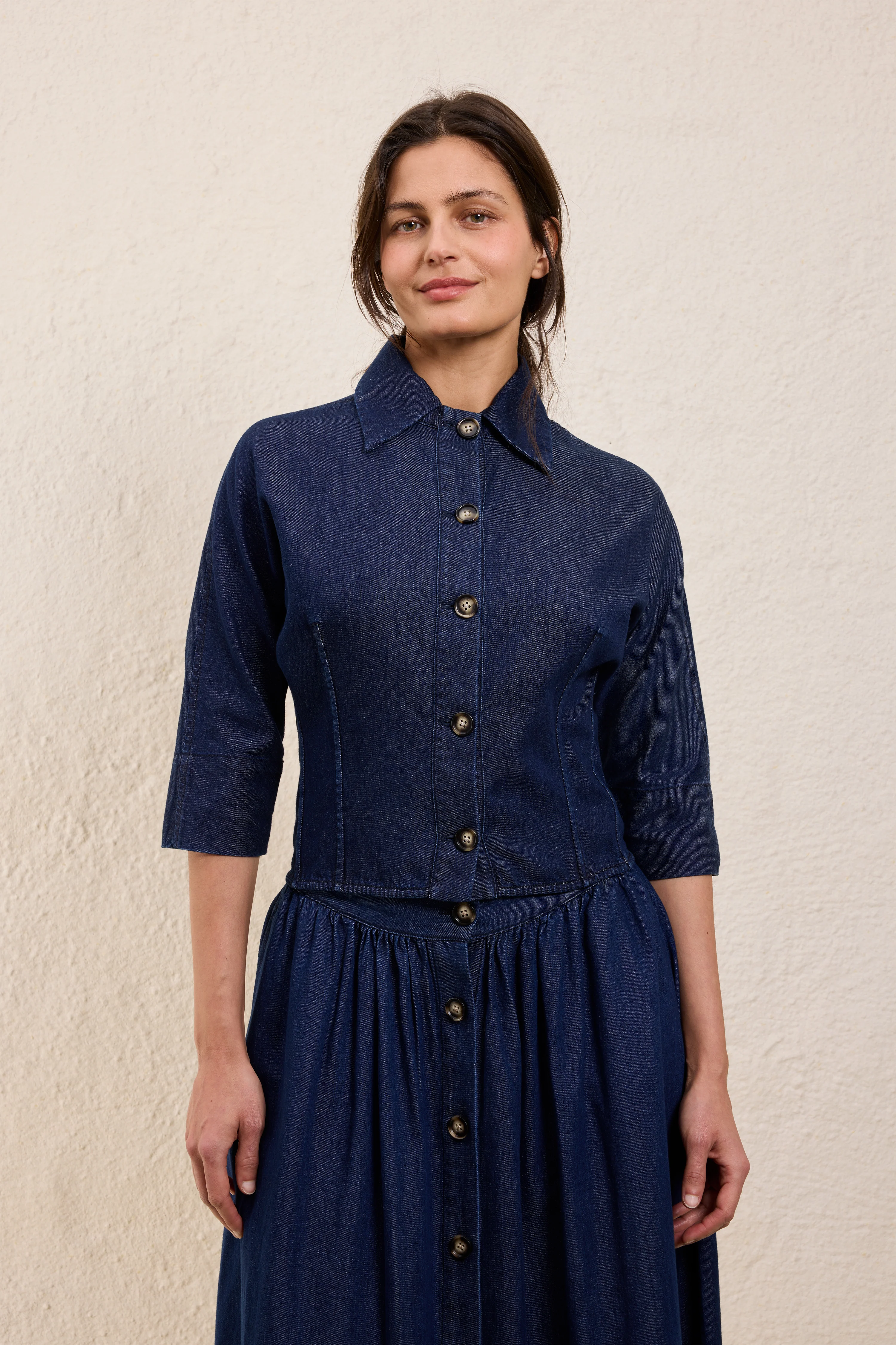 Cut in structured yet soft denim, it follows the body without feeling tight. The waist is slightly shaped, with a clean collar and buttoned front. It pairs naturally with all our denim bottoms