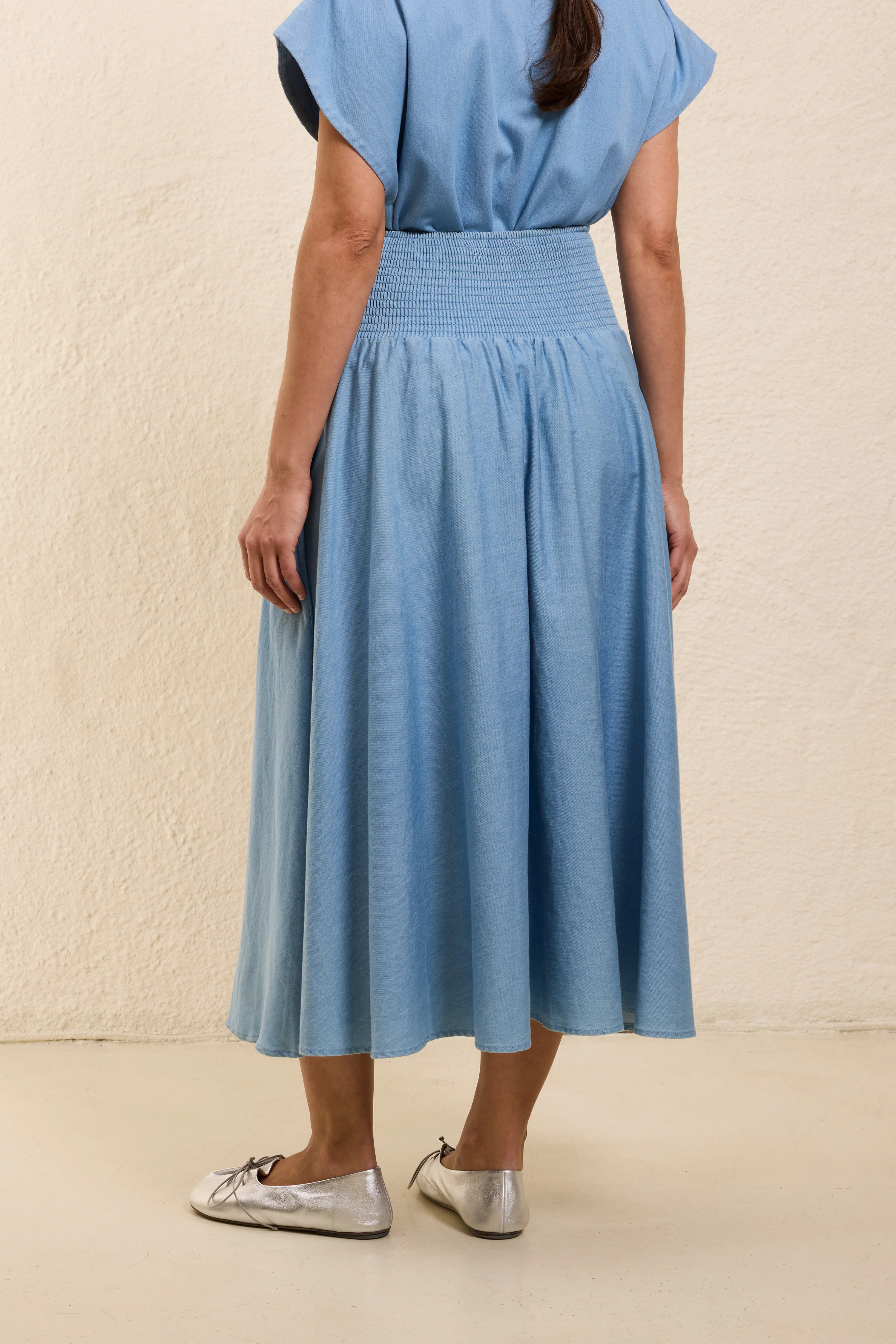 Cut with a wide smocked waistband, it sits comfortably at the waist before falling into soft gathers. The lightweight denim has a fluid drape that moves easily with the body, giving the skirt shape without stiffness. Clean at the hem, relaxed in expression. Easy to wear with a simple knit or shirt.