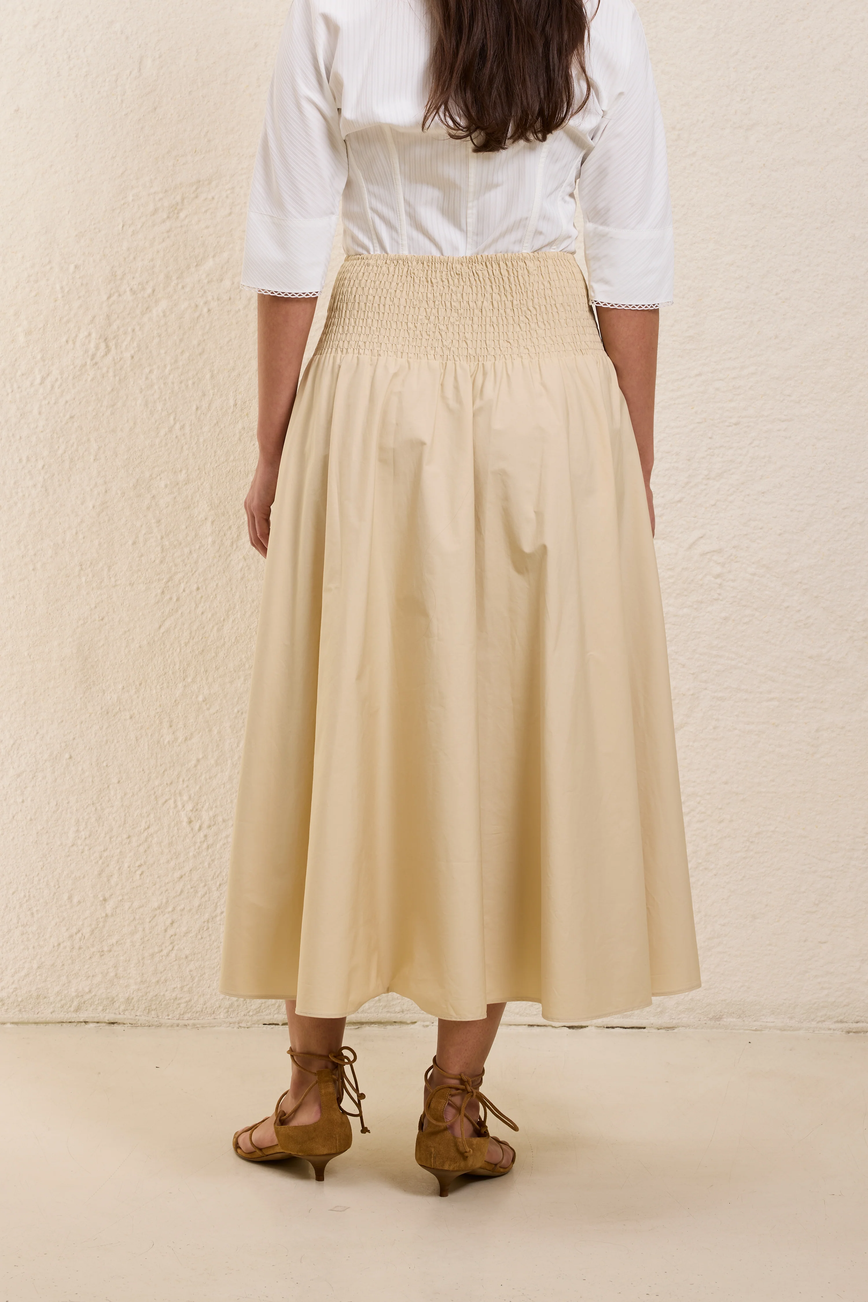 Cut with a wide waistband that sits smoothly at the waist, it falls into gentle gathers that create movement through the skirt. The cotton poplin has a crisp, lightweight feel that holds its shape while remaining easy to wear. The smocked detail at the back adds comfort and flexibility without interrupting the clean front. Midi length, fluid in motion, and balanced in proportion.