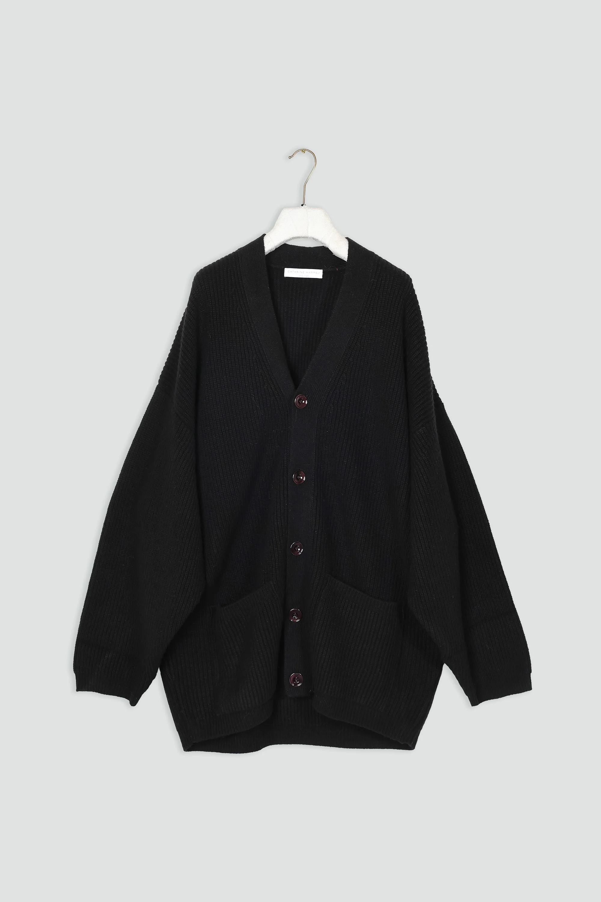 Ultramoderne, oversized ribbestrikket cardigan. Med lommer og benknapper.